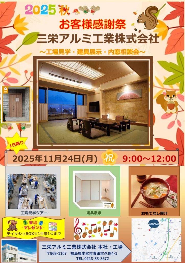 三栄アルミ工業株式会社では 今月、11月24日(祝)に「2025年秋 お客様感謝祭 」 を開催いたします!